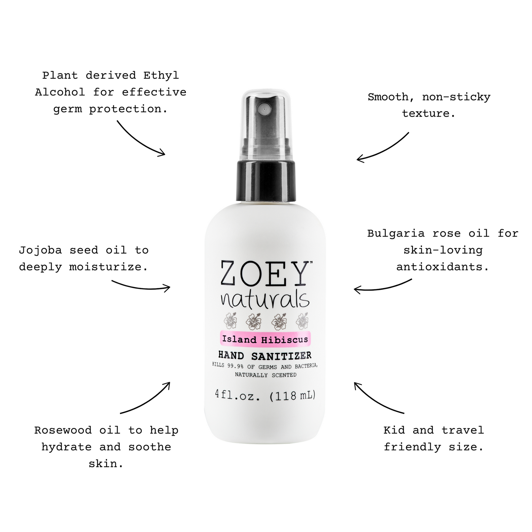 Zoey Natural's Hand Sanitizer not only effectively kills 99.9% of germs and bacteria, but also moisturizes and softens skin. Formulated with plant derived alcohol, essential oils and botanical extracts such as jojoba seed oil, we are cruelty-free, vegan, paraben-free, sulfate-free, and phthalate-free. Harsh chemicals? Goodbye! Water? Don’t need it! Small enough for a purse, diaper bag, or backpack, it is the perfect size for on-the-go moms and dads. Enjoy effective protection with every use.