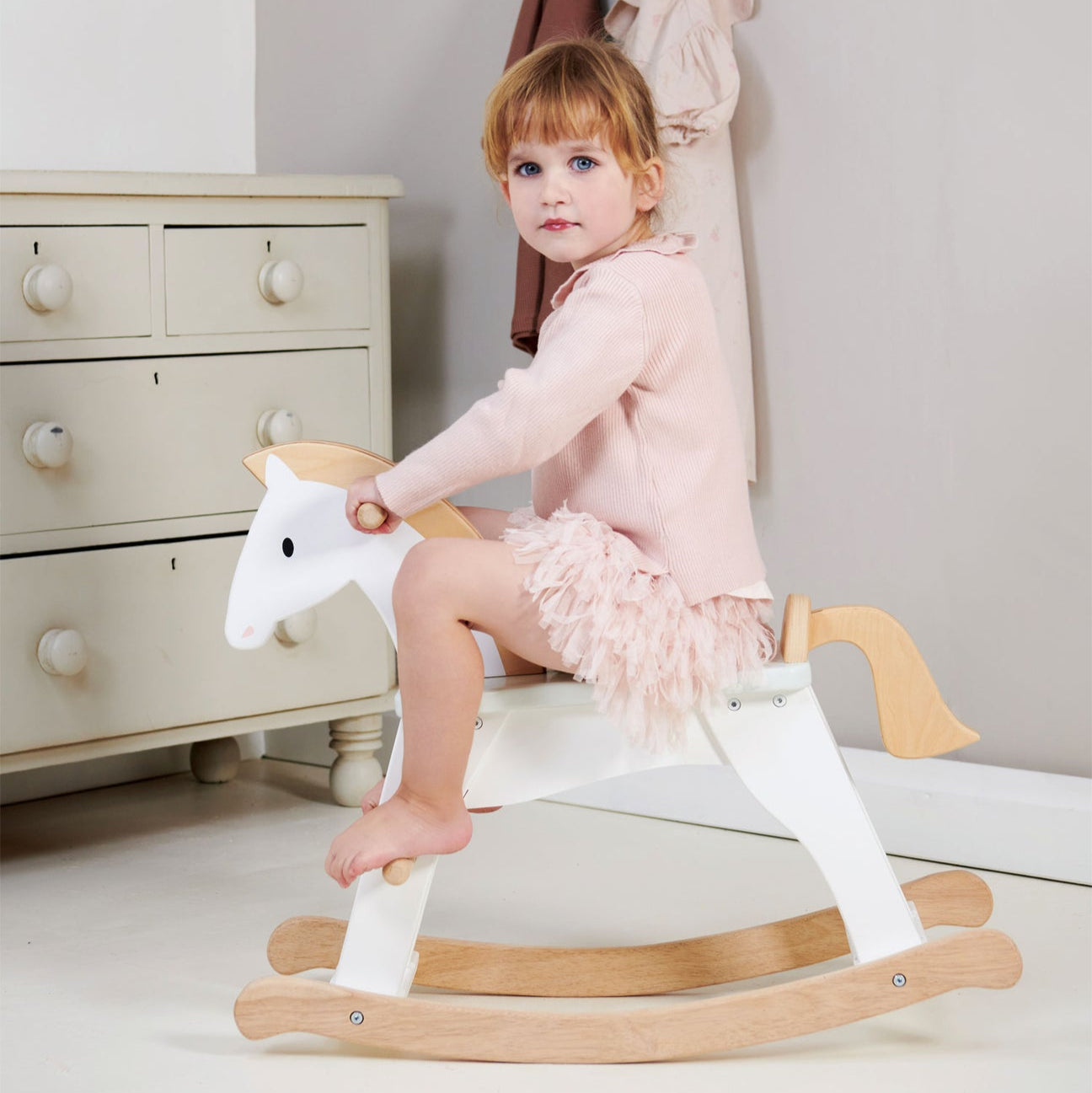 Gallop through the snowfields on your lucky horse. A premium rocking horse inspired by the classics. A traditional and essential toy for the nursery or playroom. Simple and chic, painted in white with details in wood.