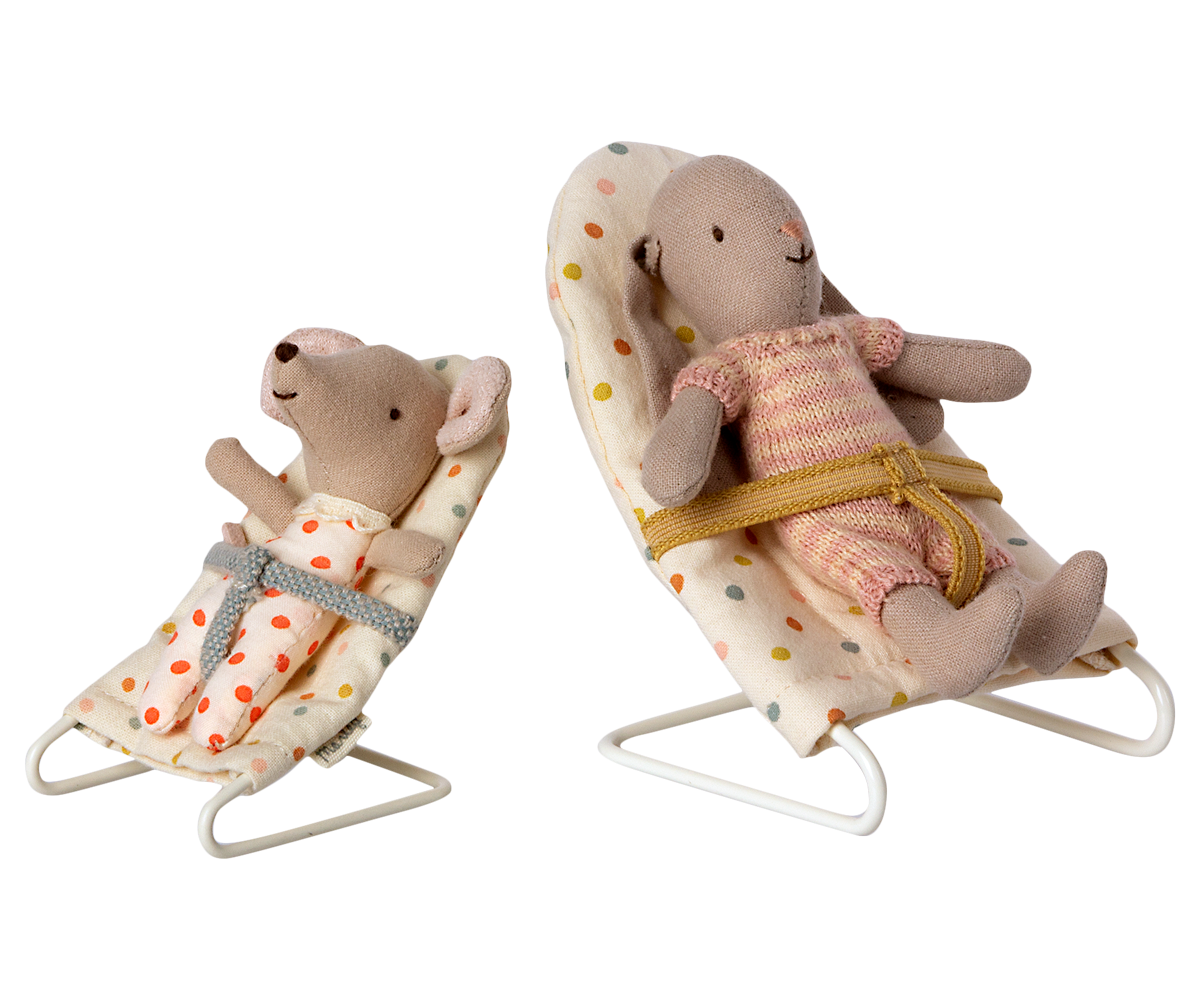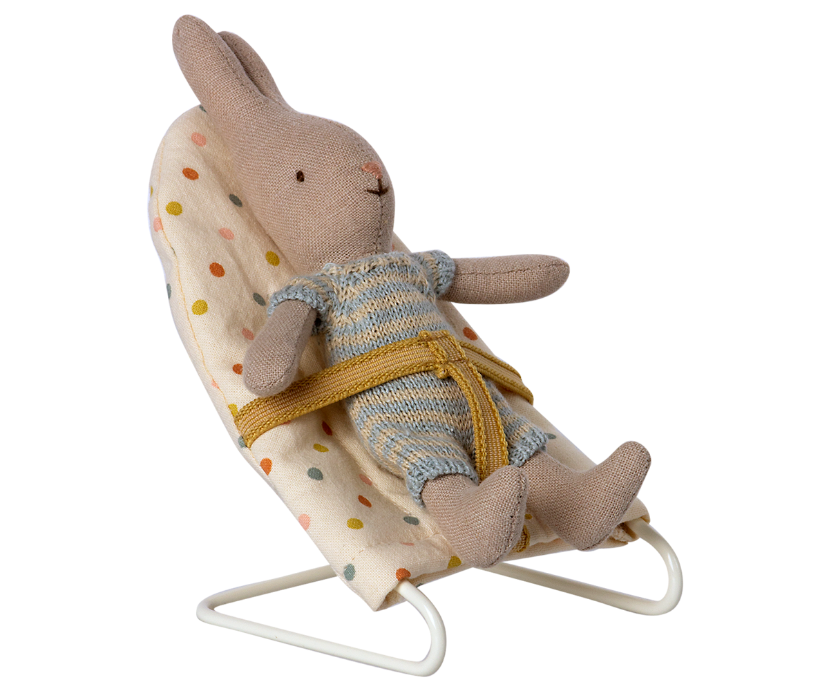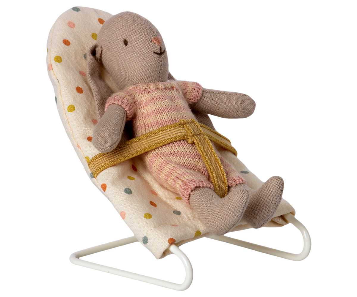 With this baby sitter, it is easy to bring your little friends to sleep. The base is made of metal and covered by the most lovely dotted fabric. The chair fits the baby mice and micro-sized rabbits and bunnies perfectly.
