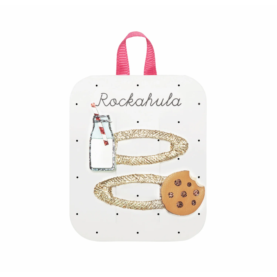 The milk and cookie clips add a splash of nostalgia to your hair! A delicious chocolate chip cookie and a glass bottle of fresh milk are set upon gold ribbon wrapped snap clips.