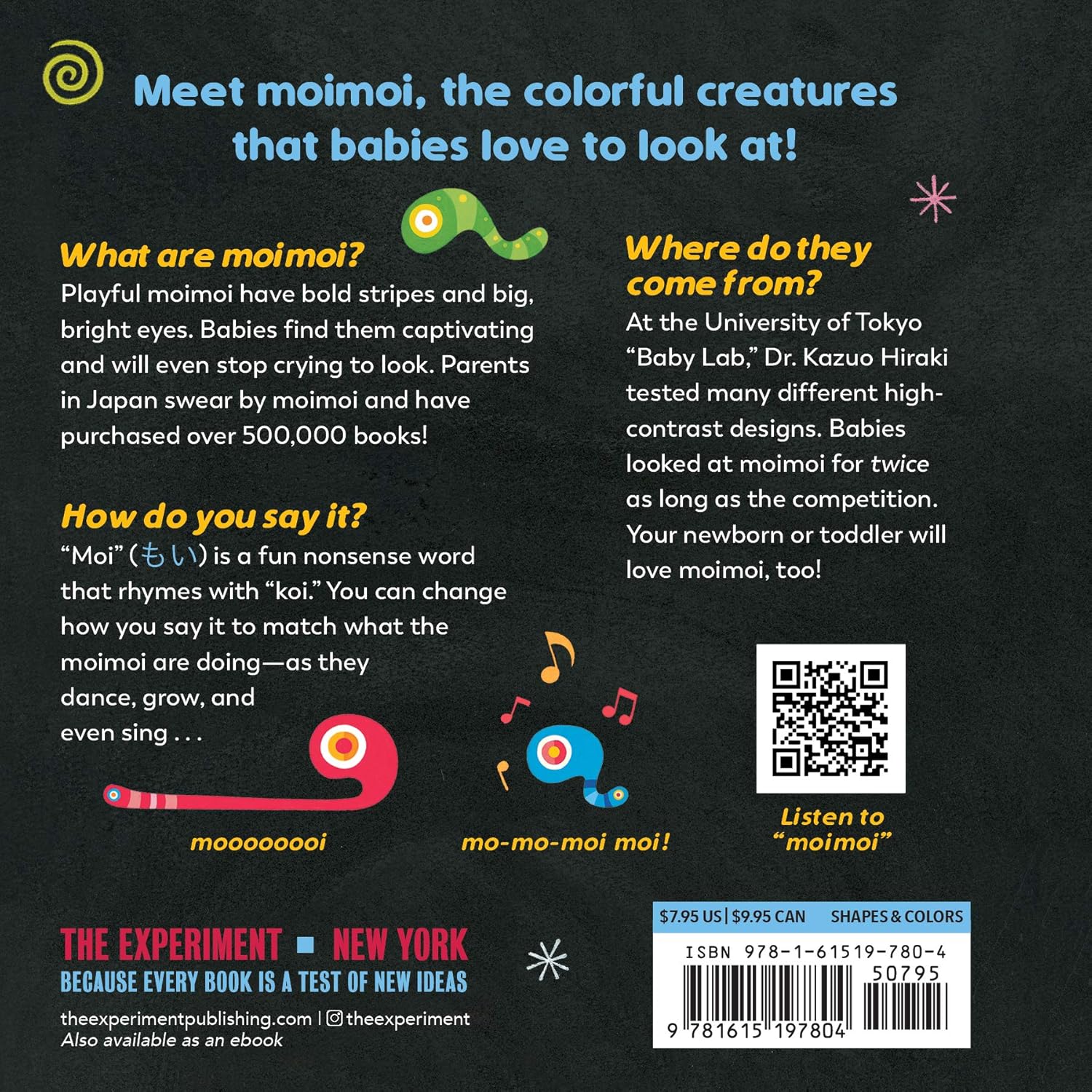 What are moimoi? Playful moimoi have bold stripes and big, bright eyes. Babies find them captivating and will even stop crying to look. Parents in Japan swear by moimoi and have purchased over 500,000 books!