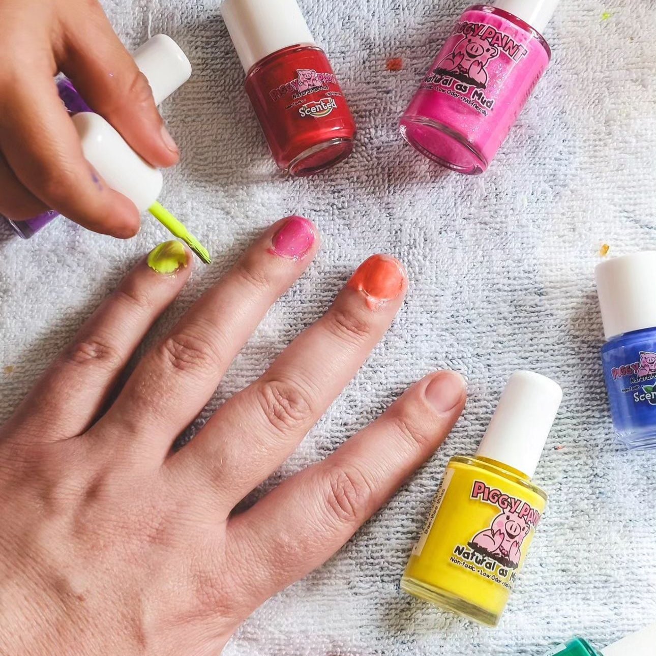 Piggy Paint is non-toxic & safe for all ages! There are no toxic chemicals; it’s free of formaldehyde, toluene, phthalates, Bisphenol A, ethyl acetate, and acetone. Say goodbye to harsh, smelly chemicals, and hello to Piggy Paint!