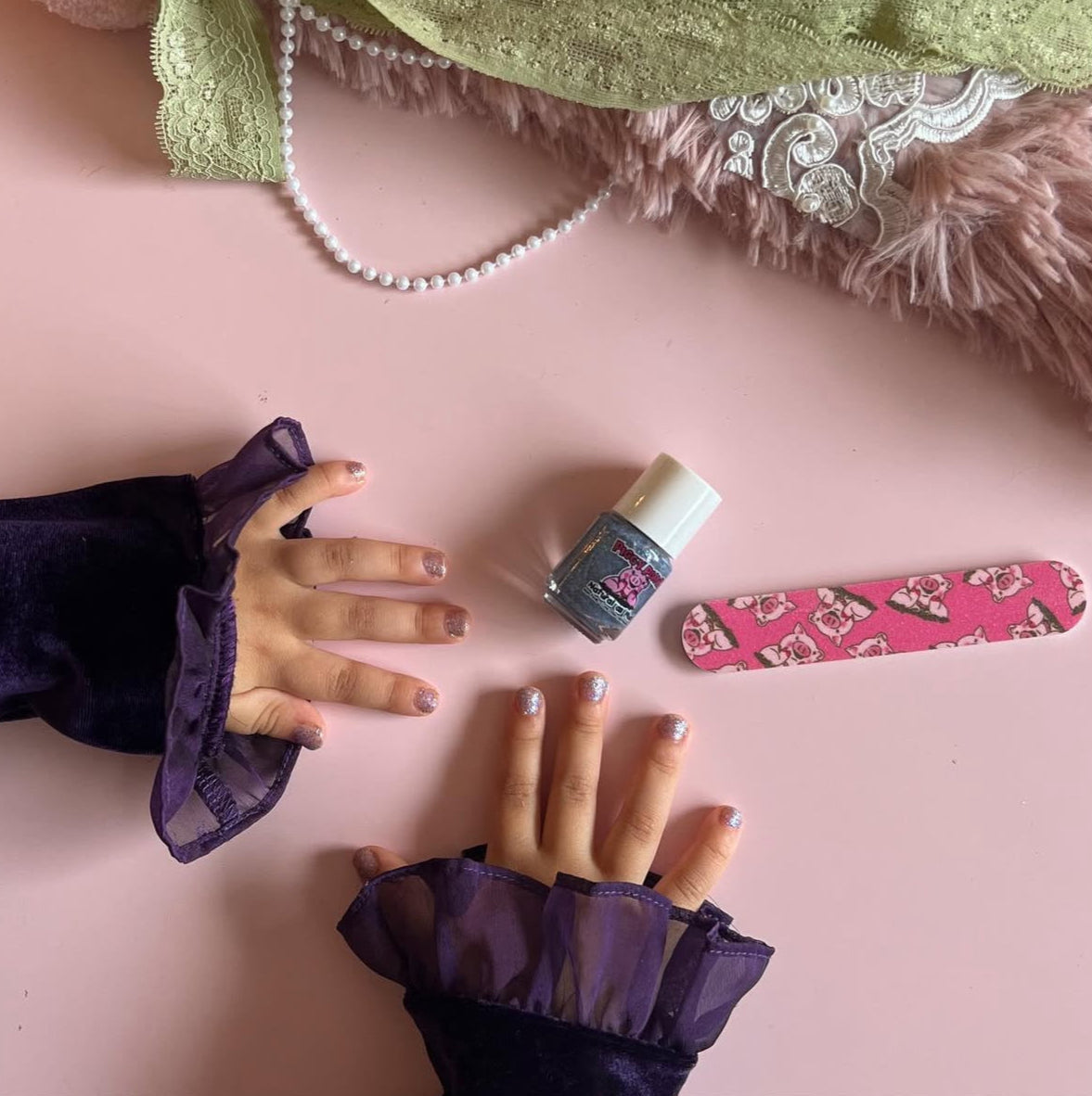 Piggy Paint is non-toxic & safe for all ages! There are no toxic chemicals; it’s free of formaldehyde, toluene, phthalates, Bisphenol A, ethyl acetate, and acetone. Say goodbye to harsh, smelly chemicals, and hello to Piggy Paint! Kids will love this multi-silver glitter that can be worn by itself or on top of darker polish colors.