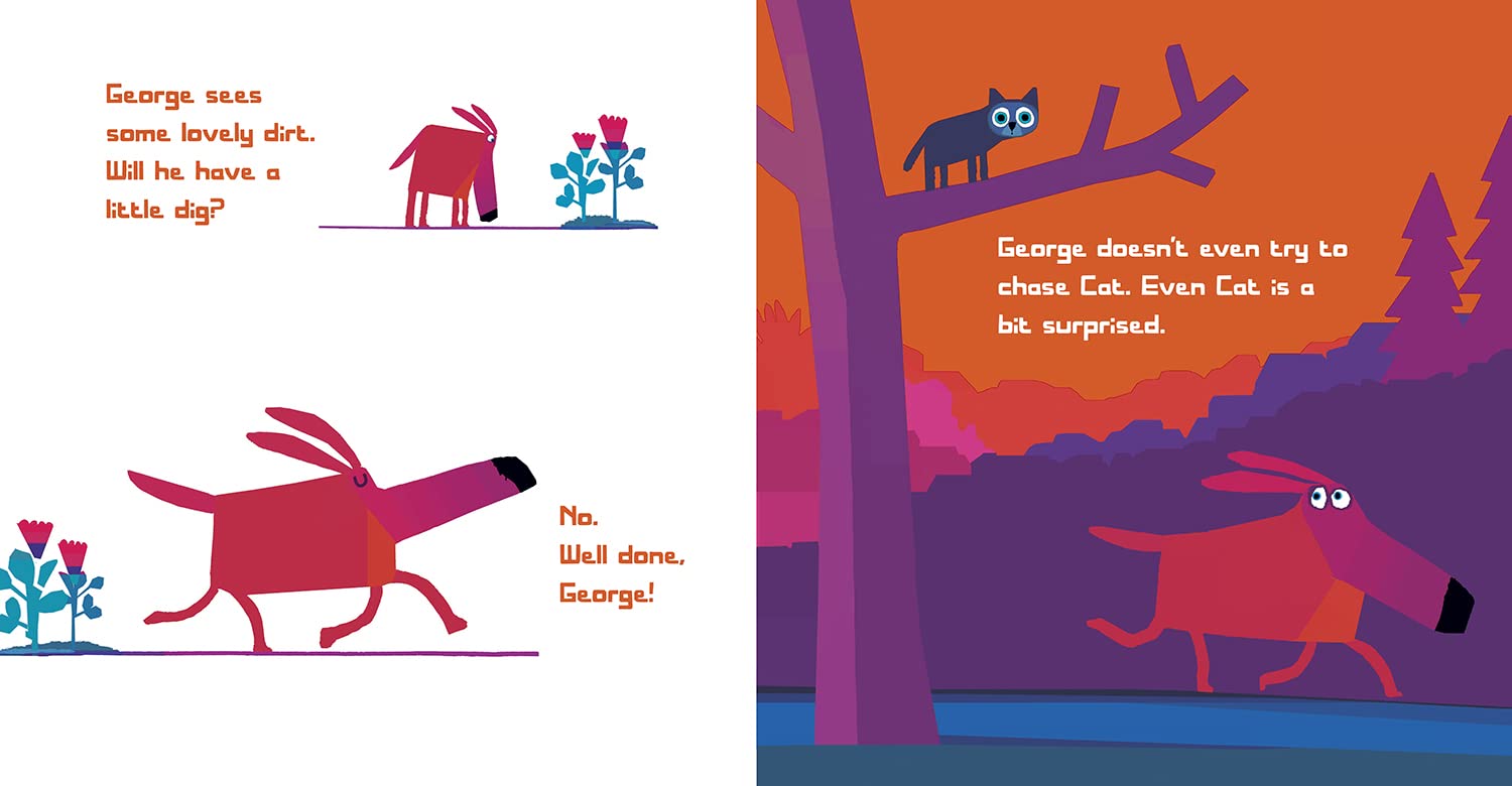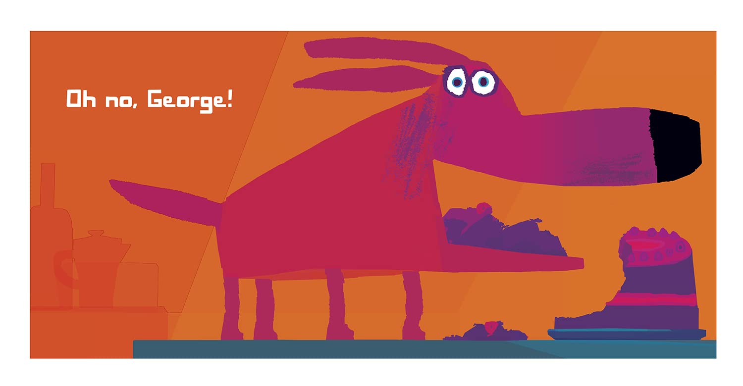 Bold, hilarious artwork captures the innocent charm of affable George, a dog who is trying to be good — with disastrous results.