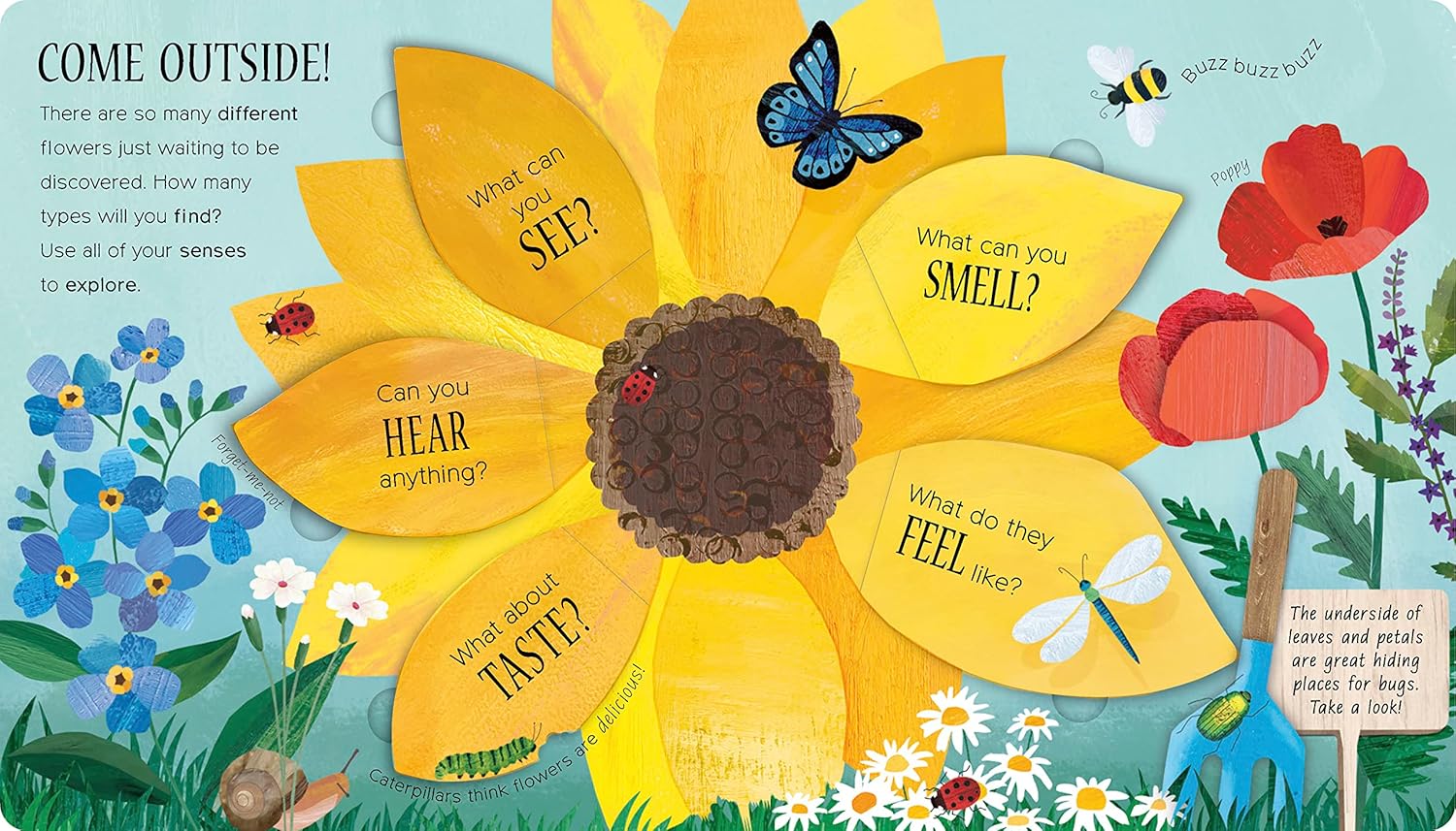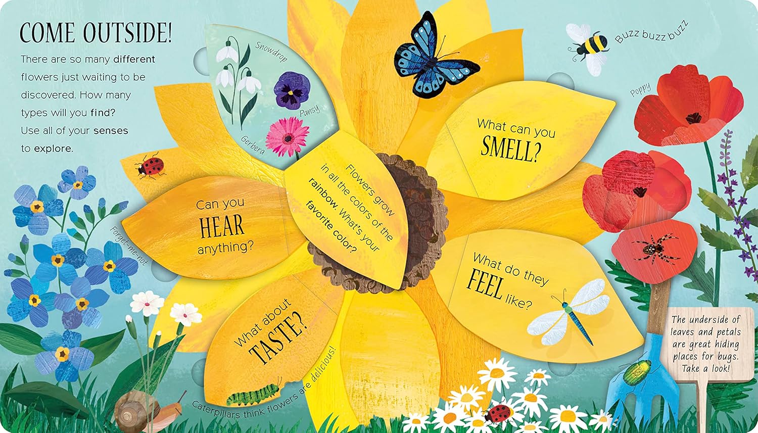 Children love to explore the outdoors. This engaging board book introduces young readers to the process of how flowers grow, encouraging them to get outside and explore their own outdoor world. They’ll read about where to find flowers, and even learn how to plant a seed of their own. Through simple facts, prompts, and activities, children will discover what different flowers smell like, what kinds of bugs use flowers for food and a place to live, how to find those bugs, and much more. This sturdy board book, which includes shaped lift-the-flaps and peek-through pages throughout, is the perfect nonfiction book to inspire a love of nature in young readers.