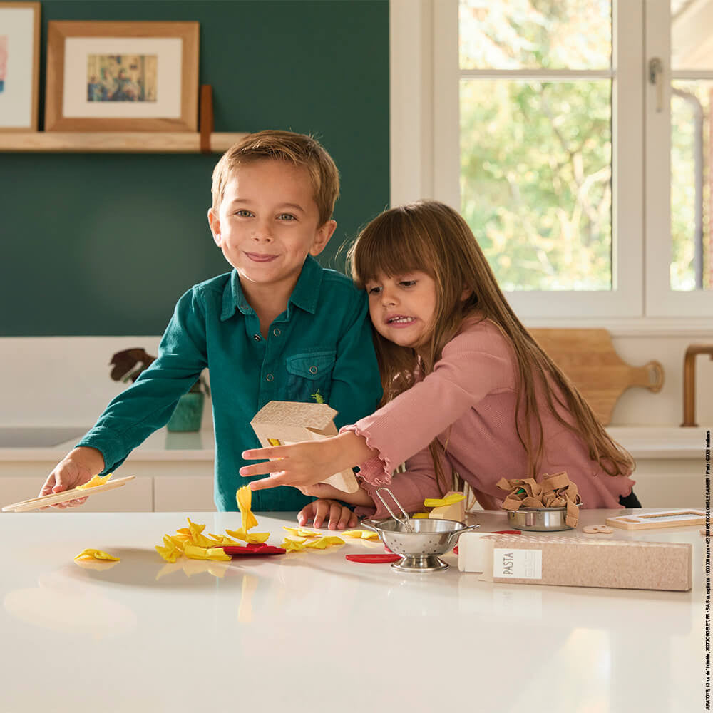 To create their specialities, children from 3 years old can use the many accessories included in this game: 20 realistic farfalle, 4 large ravioli, 6 basil leaves, 5 mushrooms and 1 tomato sauce, all made of felt. The 10 tagliatelle are made of flat ribbon that perfectly imitates the colour of this excellent pasta! There’s nothing better than parmesan cheese, a grater and a few wooden tomatoes to liven up the dishes of the mini-cooks. Everything is served on a plate using the spoon, colander and metal pan that are included. Practical, the pasta is easily stored in the two pretty cardboard packages!