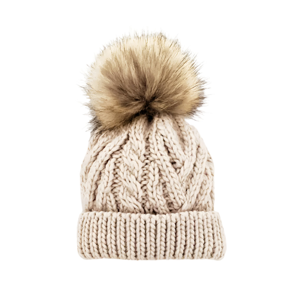 Super cozy hat hand-knit in oatmeal hued Icelandic yarn is topped with a furry pom. This is a great cold weather hat and is perfect for gift giving. It makes a fun photo prop too. Also available in other colors.