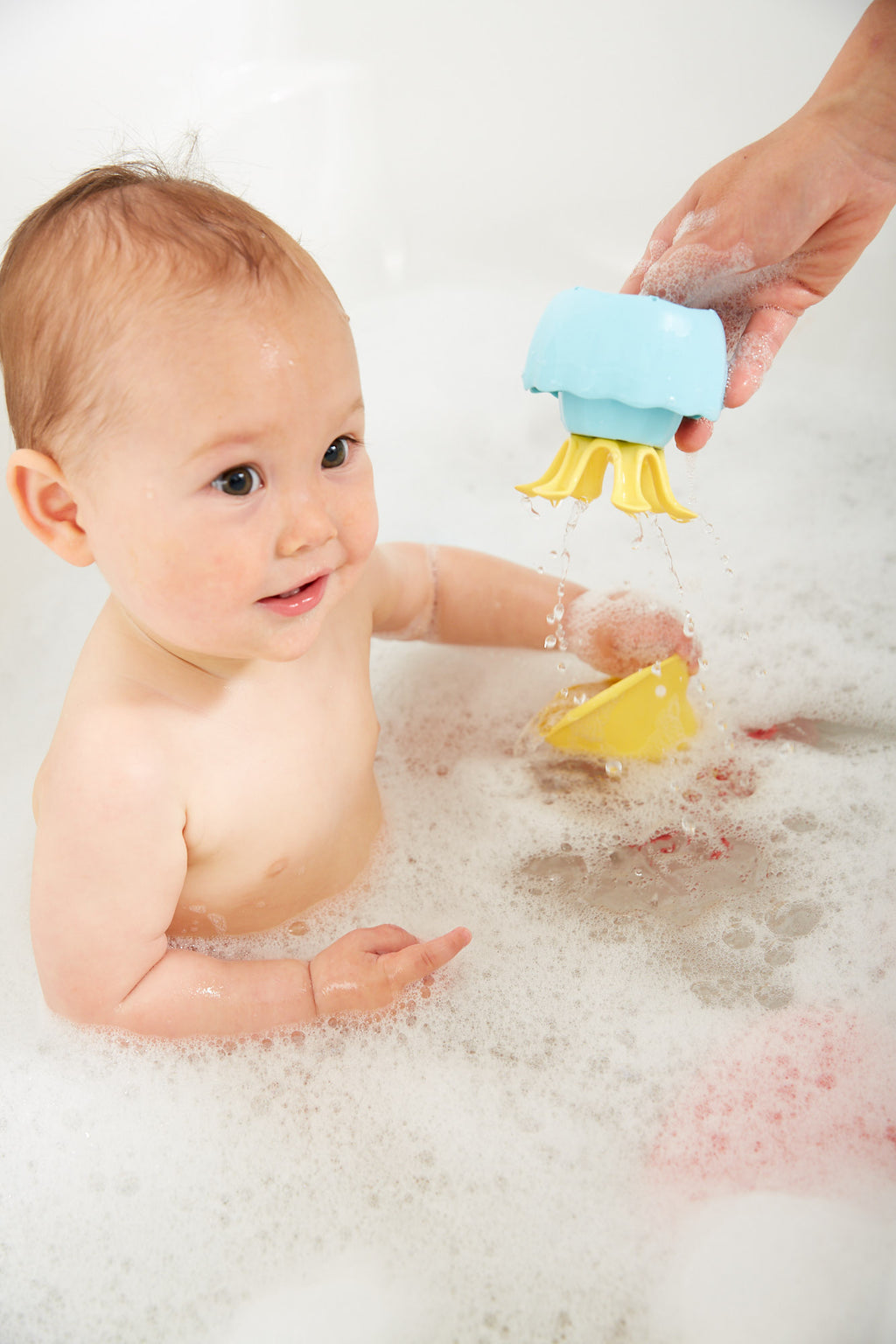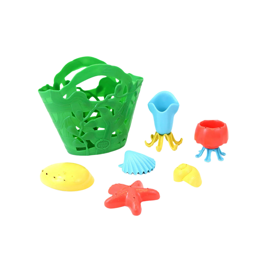 Bring the fun and learning of tide pool and water table play to the bathtub! The 7-piece Green Toys Tide Pool Bath Set includes a starfish, scallop, abalone, snail, squid, and jellyfish, as well as a seaweed-patterned storage bag. Made in the USA from 100% recycled plastic milk jugs, each of the six shells and creatures in the set are specially designed to interact with and pour water in a different way. Scoop up water with the abalone and create a cascading waterfall with the holes along the edge, or fill the jellyfish and watch the water run down and out each of the legs. The palm-sized shells are the perfect size for scooping and pouring water to wash little ones in infant tubs, while the whole set is also great for the beach and backyard. When it's time for cleanup, collect all the pieces in the storage bag (made from 100% recycled plastic bags!). The holes throughout the sides and bottom of the bag allow water to drain out and pieces to dry between uses.