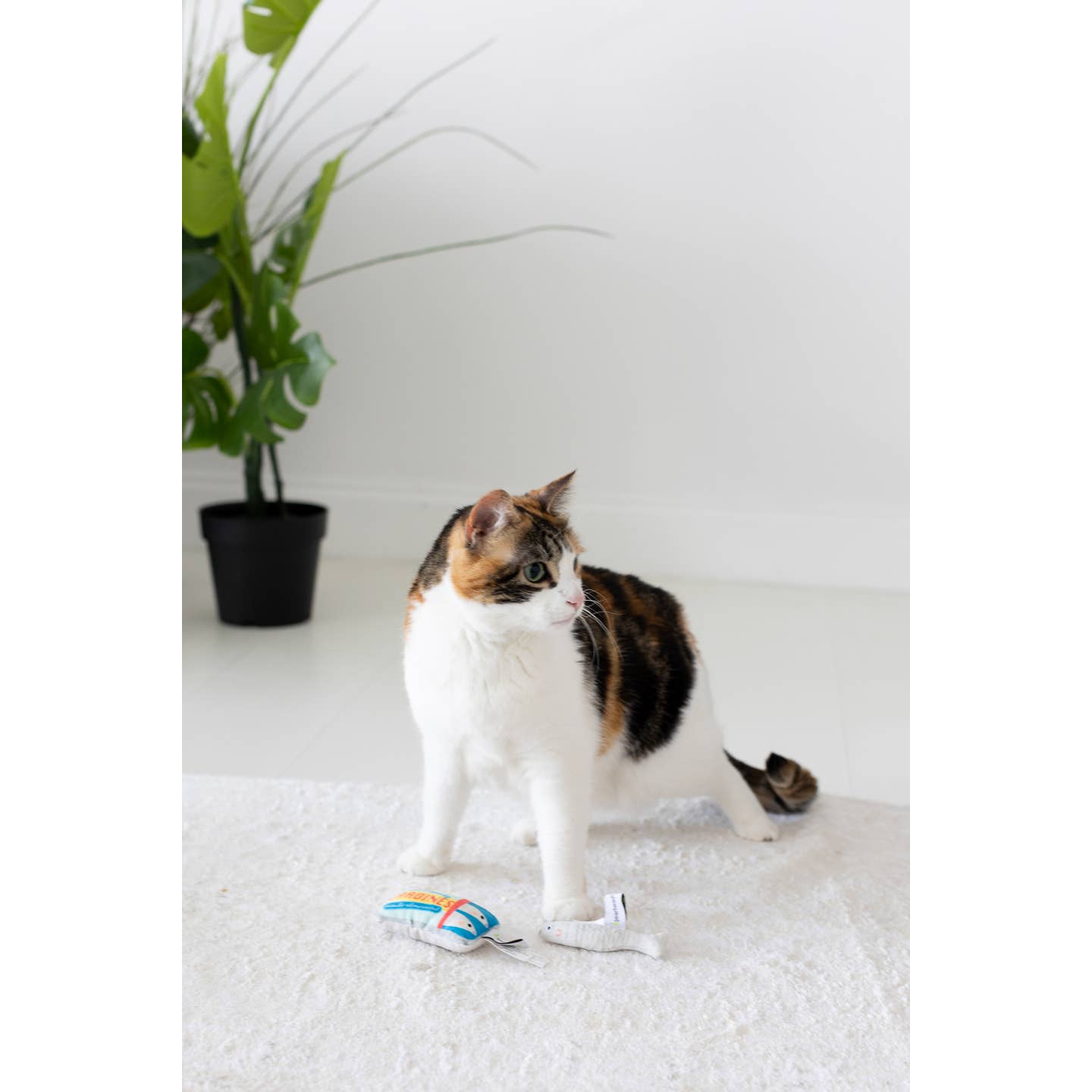 - Includes two plush cat toys: one crinkle sardine and one plush sardine tin