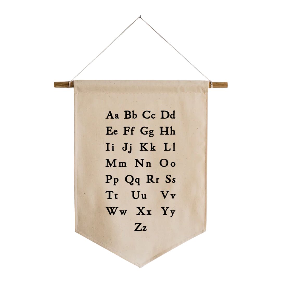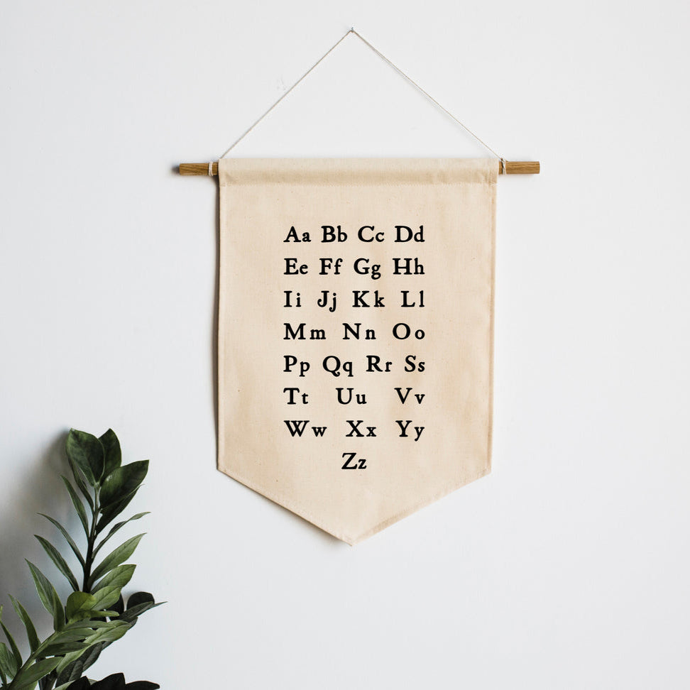 This schoolhouse-inspired banner is a lovely mix of neutral, natural materials - including canvas, oak wood, and cotton twine - with all materials sourced in the United States, sewn locally, and printed in-house by hand.