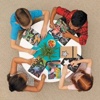 Scratch away to reveal astronauts, astro dogs and cats in Space Explorers Scratch Art Kit with easy-to-follow guidelines. It’s a snap to create incredible works of art with the 4 guided illustrations that are super easy for kids to follow. Or use your imagination to scratch your own designs onto the 2 rainbow cards or the 2 sparkle cards; the rainbow and sparkle are hidden until you scratch in your design. And once you’re done scratching the fun doesn’t end there. You can frame the cards or cut out the designs to create new characters to play with! Plus the sticker sheet can be scratched to reveal more sparkly fun! Each space scratch art kit has everything needed to make beautiful scratch art.