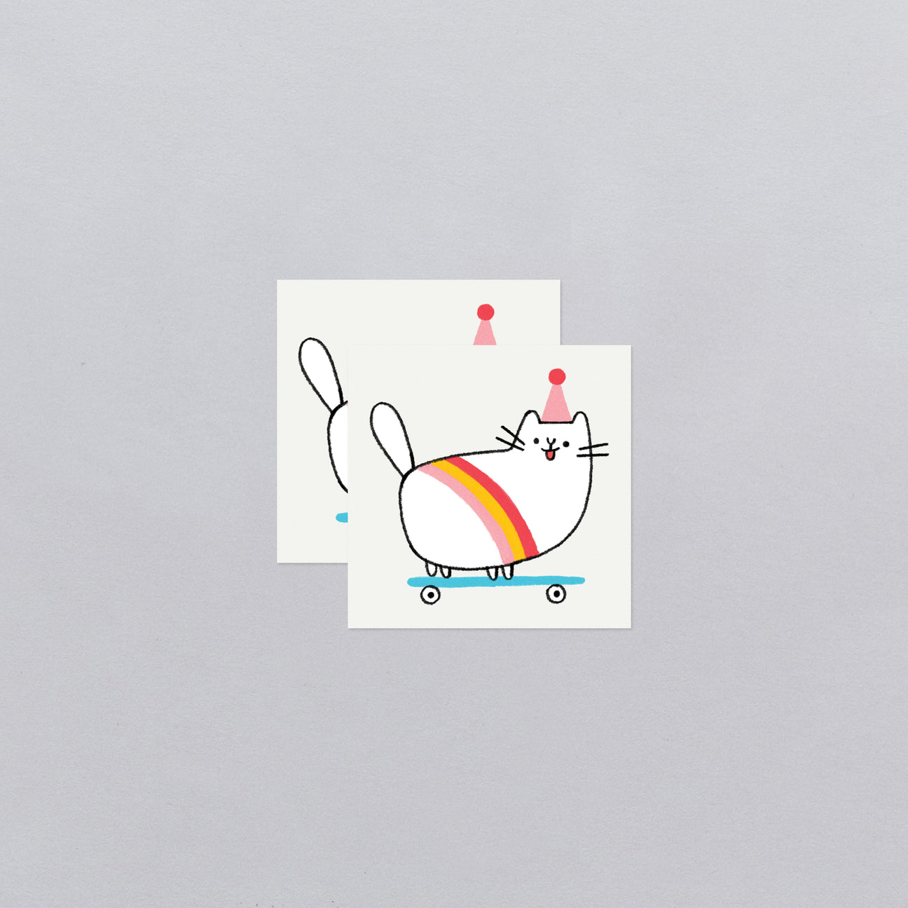 Purrfectly Playful Design – Features a cool cat on a skateboard, complete with a rainbow trail and party hat, crafted by artist Linzie Hunter.