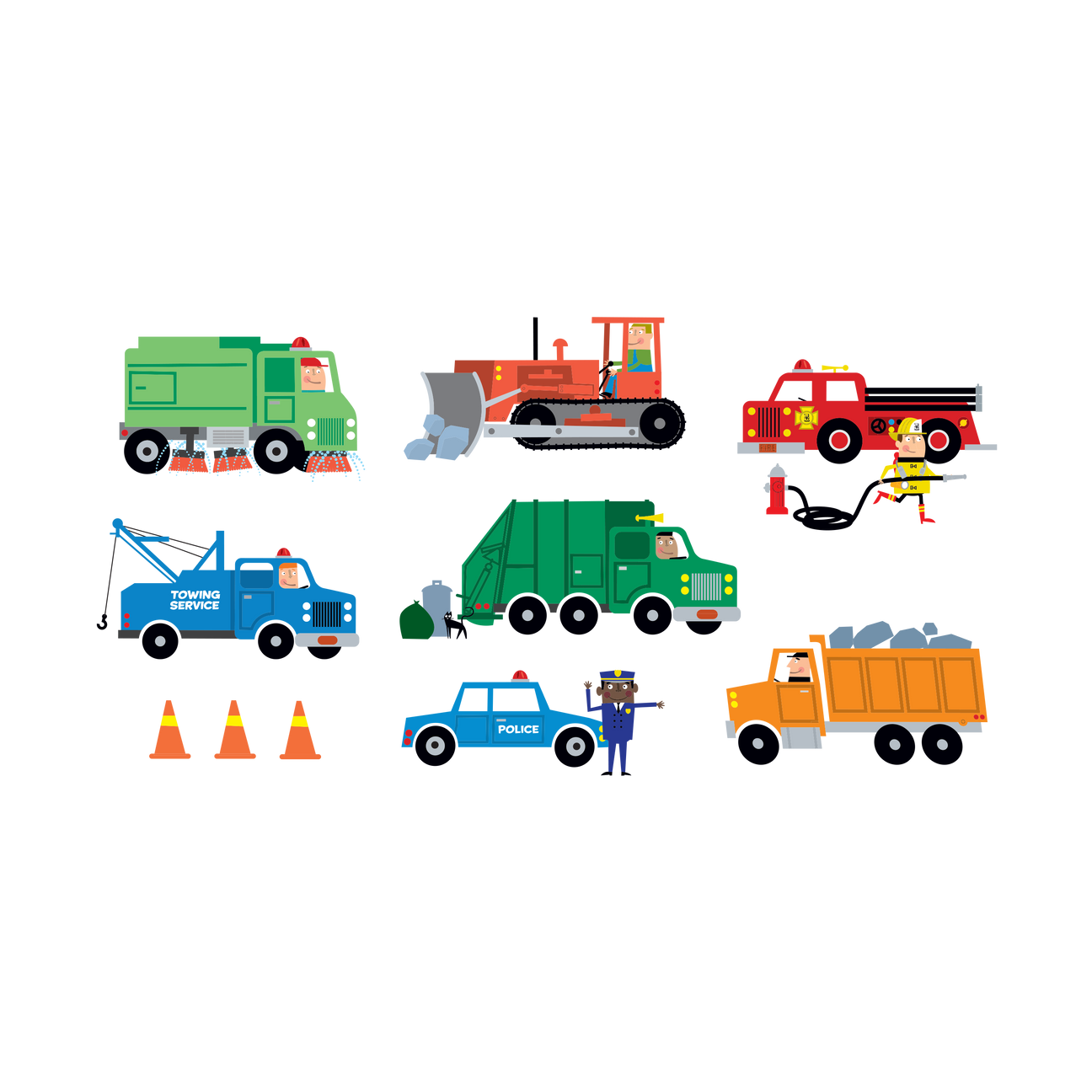 Vibrant Vehicle Designs – Features a delightful collection of traffic-themed tattoos, including a fire truck, plow truck, police car, rock mover, sanitation truck, street sweeper, tow truck, and traffic cones.