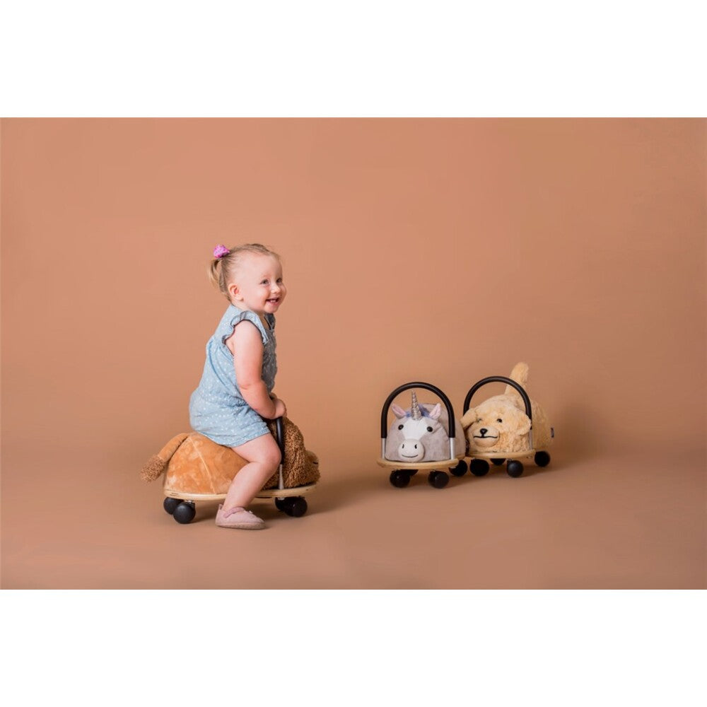 Wheely Bugs are ultra-sturdy ride-on toys in the shape of a friendly animal. They can make 360˚ turns and roll forwards, backwards, left, right and diagonally. Children can ride on them, push or pull them, and even cuddle and kiss them. The Wheely Bug has four castors, a covered push bar and a soft, easy-care body. Rounded corners guarantee that the base is safe and ergonomic. This is the ideal toy for endless fun on any hard floor, and perfect for indoor use.