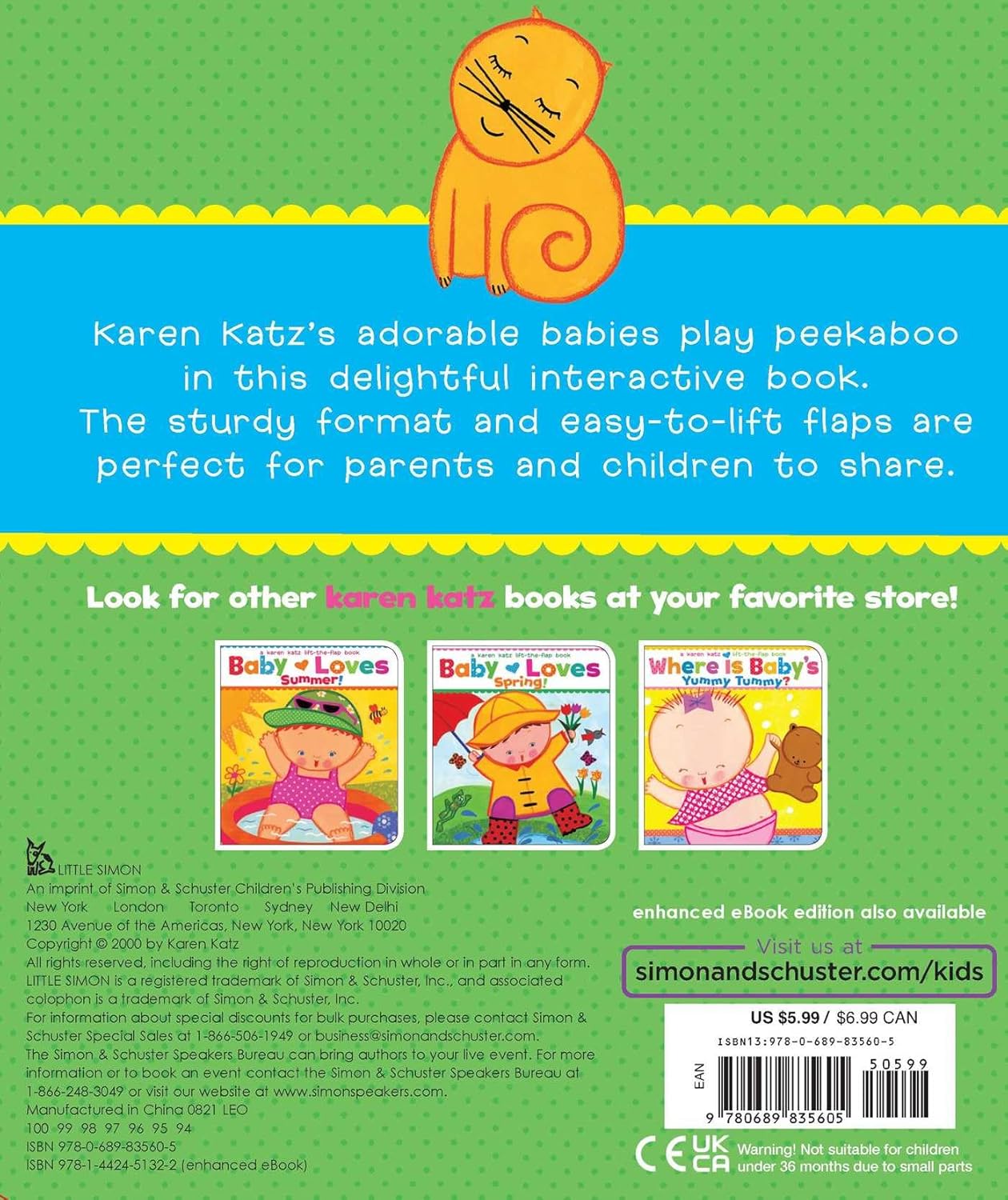 Karen Katz's adorable babies play peekaboo in this delightful interactive book. The sturdy format and easy-to-lift flaps are perfect for parents and children to share.